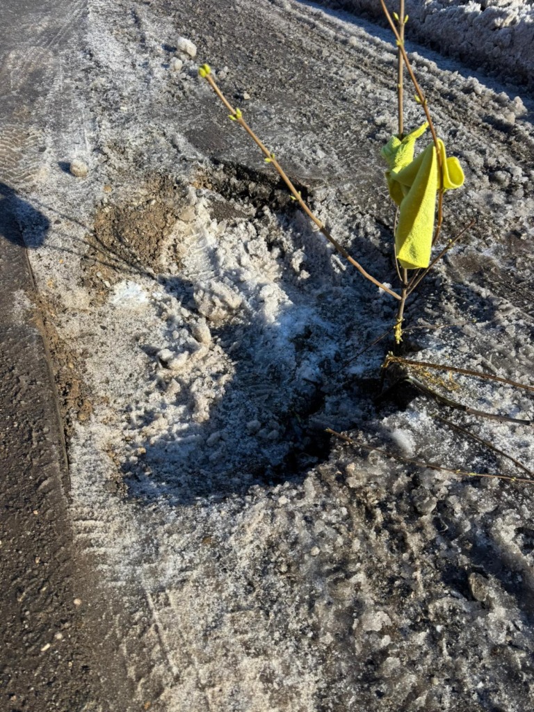 Imaginile arată clar că nu există o semnalizare profesionistă: nici balize reflectorizante, nici indicatoare de avertizare, nici restricții temporare de circulație. Doar o improvizație fragilă, insuficientă, care nu oferă vizibilitate reală pe timp de noapte sau în condiții meteo nefavorabile probabil acea creangă fiind amplasată în groapă de un cetățean binevoitor.