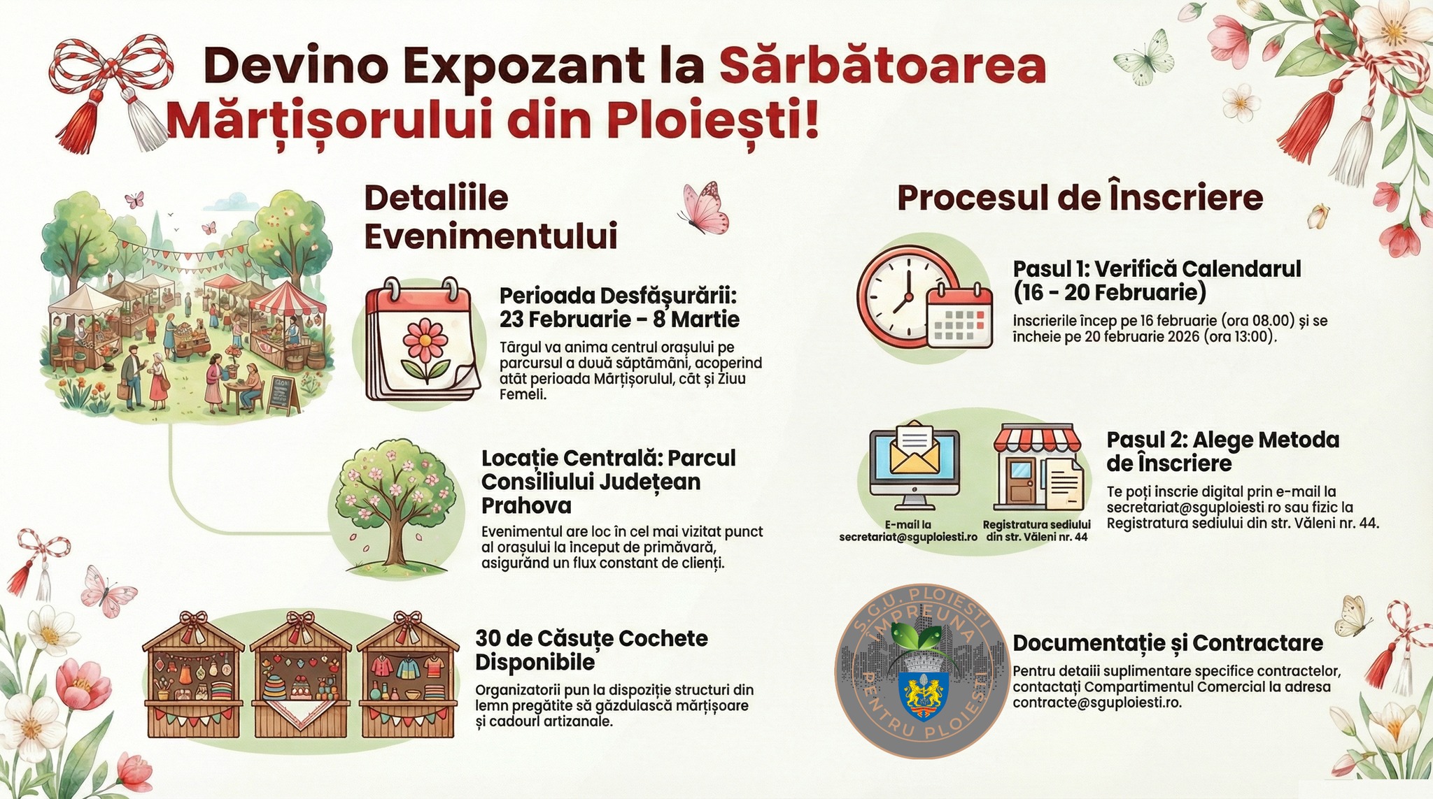 Primăvara își face simțită prezența la Ploiești printr-un eveniment de tradiție și suflet românesc: Sărbătoarea Mărțișorului, un târg dedicat simbolului renașterii, feminității și bucuriei de a dărui. Organizatorul SGU Ploiești invită artizani, producători și comercianți să devină expozanți în cadrul unei manifestări ce promite să anime centrul orașului timp de două săptămâni.