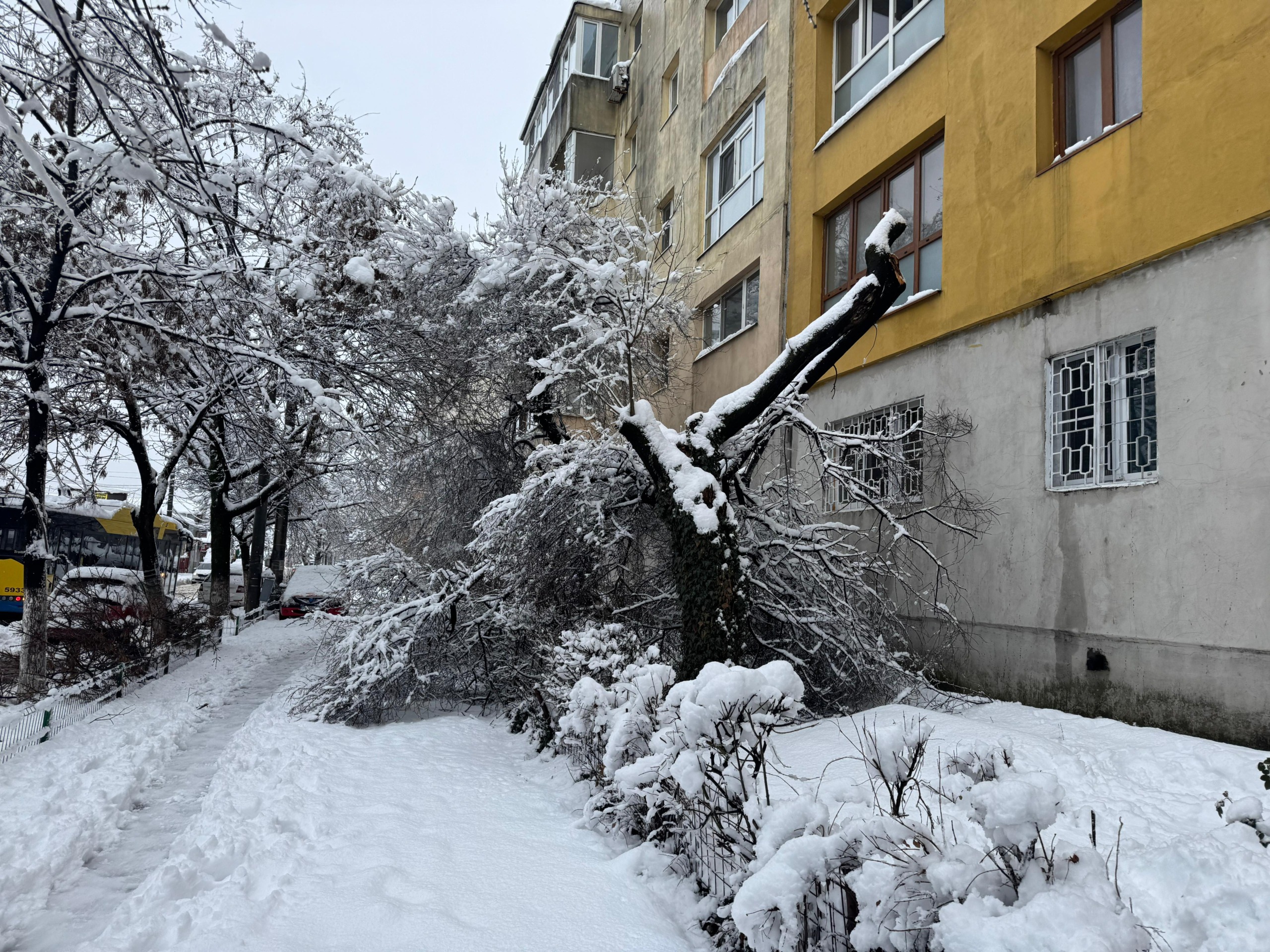 Autobuze și trolee blocate pe traseu, stații înzăpezite, oameni nevoiți să aștepte în frig – aceasta a fost imaginea dimineții. În plus, mai mulți pomi au cedat sub greutatea zăpezii, iar intervențiile au fost întârziate sau insuficiente în primele ore critice.